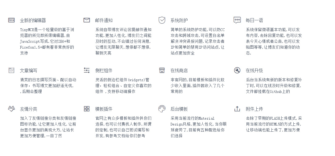 Cola主题是基于EMlog开源程序开发的成品模板,目前EM的主题市场不缺各种多功能主题,但本套主题主要打造简约而不简单为主,没有多余的花俏,功能实用,SEO简单优化。Cola主题适用于博客站、图片站、多媒体分享站、下载站! 单页设置:读者page-contact,归档page-archivers 功能简介: 1.主题集成图片布局,博客布局(后台可设置) 2.模板自适应 3.集成AOS插件(后台可开关) 4.集成自动标签内链,模板压缩,视频分类(购买赠送插件) 5.集成代码高亮功能 6.单页功能:读者,归档,微语 2018-2-3更新: 修正小量CSS,增加内页侧边栏。修复JS问题 祛除AOS插件 该模板为蓝优网免费分享转载请留版权